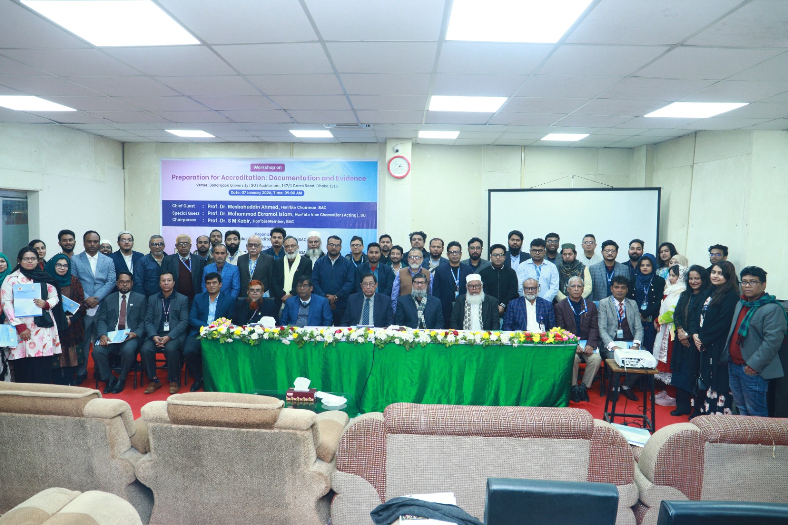 কর্মশালায় প্রধান অতিথি ছিলেন- বাংলাদেশ অ্যাক্রেডিটেশন কাউন্সিল (BAC)-এর চেয়ারম্যান প্রফেসর ড. মেসবাহউদ্দিন আহমেদ, বিশেষ অতিথি ছিলেন সোনারগাঁও ইউনিভার্সিটির উপাচার্য (ভারপ্রাপ্ত) প্রফেসর ড. মোহাম্মদ একরামুল ইসলাম, এবং অনুষ্ঠানের সভাপতিত্ব করেন BAC-এর পূর্ণকালীন সদস্য প্রফেসর ড. এস. এম. কবির।