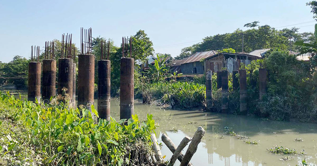 সরেজমিনে গিয়ে দেখা যায়, সেতুর নির্মাণস্থলে কাজ আংশিক শেষ হয়ে পিলারের কতগুলো রড দাঁড়িয়ে আছে। পরবর্তী কাজের জন্য ঠিকাদারের কোনো মালপত্র সেখানে নেই। নেই কাজের কোনো সাইনবোর্ড, নেই কোনো শ্রমিক। চলাচলের জন্য পূর্ব পাশ দিয়ে যে বিকল্প সাঁকো করা হয়েছে, সেটিও ঝুঁকিপূর্ণ অবস্থায় রয়েছে।