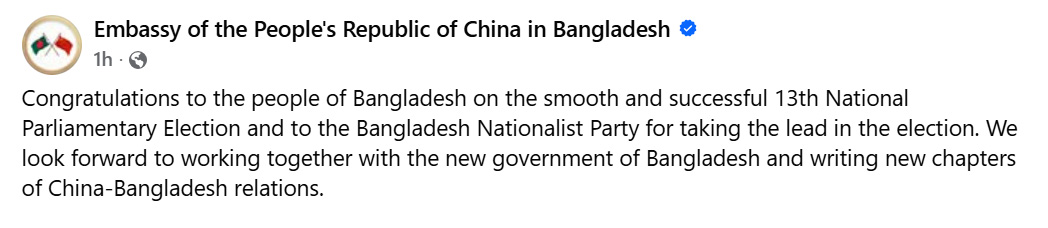 এতে বলা হয়, ‘ত্রয়োদশ জাতীয় সংসদ নির্বাচন সুষ্ঠু ও সফলভাবে সম্পন্ন করার জন্য বাংলাদেশের জনগণ এবং নির্বাচনে এগিয়ে থাকার জন্য বাংলাদেশ জাতীয়তাবাদী দলকে অভিনন্দন। আমরা বাংলাদেশের নতুন সরকারের সঙ্গে একসাথে কাজ করার এবং চীন-বাংলাদেশ সম্পর্কের নতুন অধ্যায় লেখার জন্য অধীর আগ্রহে অপেক্ষা করছি।’