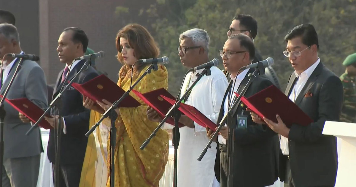 মঙ্গলবার (১৭ ফেব্রুয়ারি) বিকেল ৪টা ২০ মিনিটে জাতীয় সংসদ ভবনের দক্ষিণ প্লাজায় এক বর্ণাঢ্য অনুষ্ঠানে তারা শপথ গ্রহণ করেন। রাষ্ট্রপতি মো. সাহাবুদ্দিন তাদের শপথ পাঠ করান।