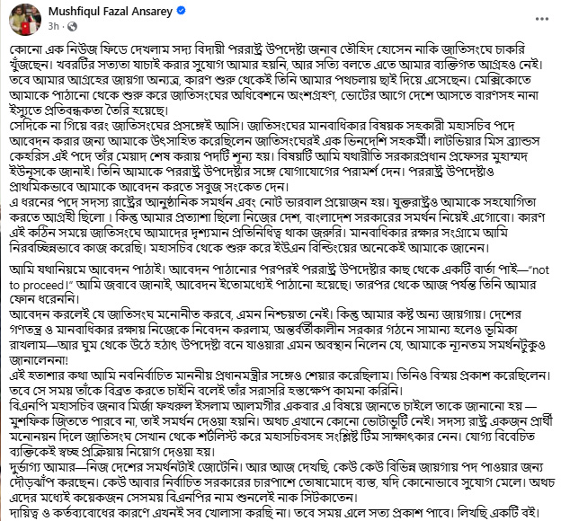মুশফিকুল ফজল আনসারী লেখেন, ‘কোনো এক নিউজ ফিডে দেখলাম সদ্য বিদায়ি পররাষ্ট্র উপদেষ্টা তৌহিদ হোসেন নাকি জাতিসংঘে চাকরি খুঁজছেন। খবরটির সত্যতা যাচাই করার সুযোগ আমার হয়নি, আর সত্যি বলতে এতে আমার ব্যক্তিগত আগ্রহও নেই। তবে আমার আগ্রহের জায়গা অন্যত্র, কারণ শুরু থেকেই তিনি আমার পথচলায় ছাই দিয়ে এসেছেন। মেক্সিকোতে আমাকে পাঠানো থেকে শুরু করে জাতিসংঘের অধিবেশনে অংশগ্রহণ, ভোটের আগে দেশে আসতে বারণসহ নানা ইস্যুতে প্রতিবন্ধকতা তৈরি হয়েছে।’