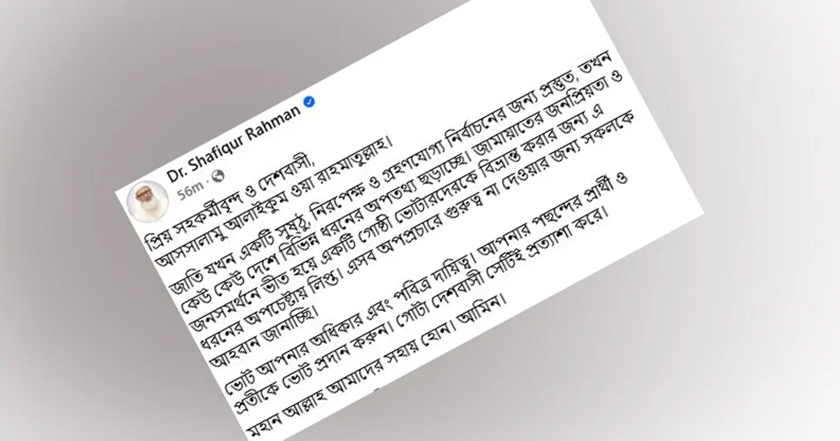শফিকুর রহমান লেখেন, ‘জাতি যখন একটি সুষ্ঠু, নিরপেক্ষ ও গ্রহণযোগ্য নির্বাচনের জন্য প্রস্তুত, তখন কেউ কেউ দেশে বিভিন্ন ধরনের অপতথ্য ছড়াচ্ছে। জামায়াতের জনপ্রিয়তা-জনসমর্থনে ভীত হয়ে একটি গোষ্ঠী ভোটারদেরকে বিভ্রান্ত করার জন্য এ ধরনের অপচেষ্টায় লিপ্ত। এসব অপপ্রচারে গুরুত্ব না দেওয়ার জন্য সকলকে আহবান জানাচ্ছি।’