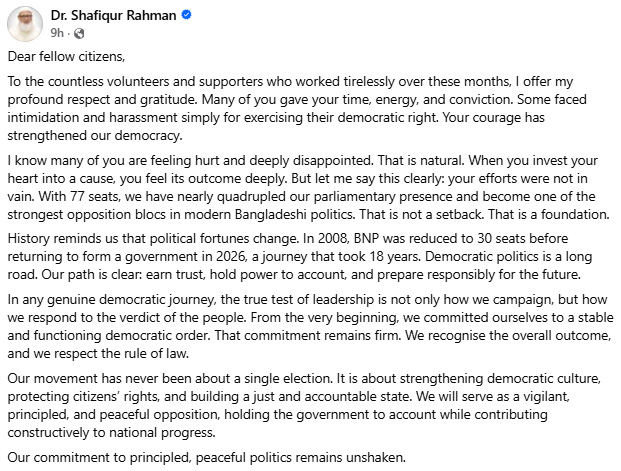 পোস্টে তিনি লেখেন, ‘আমাদের আন্দোলন কখনো একটি নির্বাচন নিয়ে হয়নি। গণতান্ত্রিক সংস্কৃতি শক্তিশালী করা, নাগরিকদের অধিকার রক্ষা করা এবং একটি ন্যায়নিষ্ঠ ও জবাবদিহিতা রাষ্ট্র গড়ে তোলাই আমাদের উদ্দেশ্য। জামায়াত একটি নীতিবান, দায়িত্বশীল ও শান্তিপূর্ণ বিরোধী দল হিসেবে সংসদে ভূমিকা পালন করবে এবং সরকারের জবাবদিহি নিশ্চিত করে জাতীয় অগ্রগতিতে গঠনমূলক অবদান রাখবে। নীতিগত ও শান্তিপূর্ণ রাজনীতির প্রতি আমাদের অঙ্গীকার অটল।’